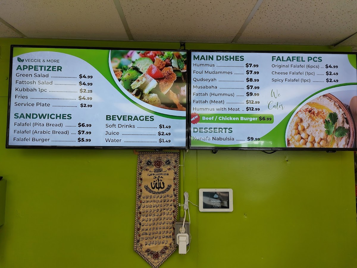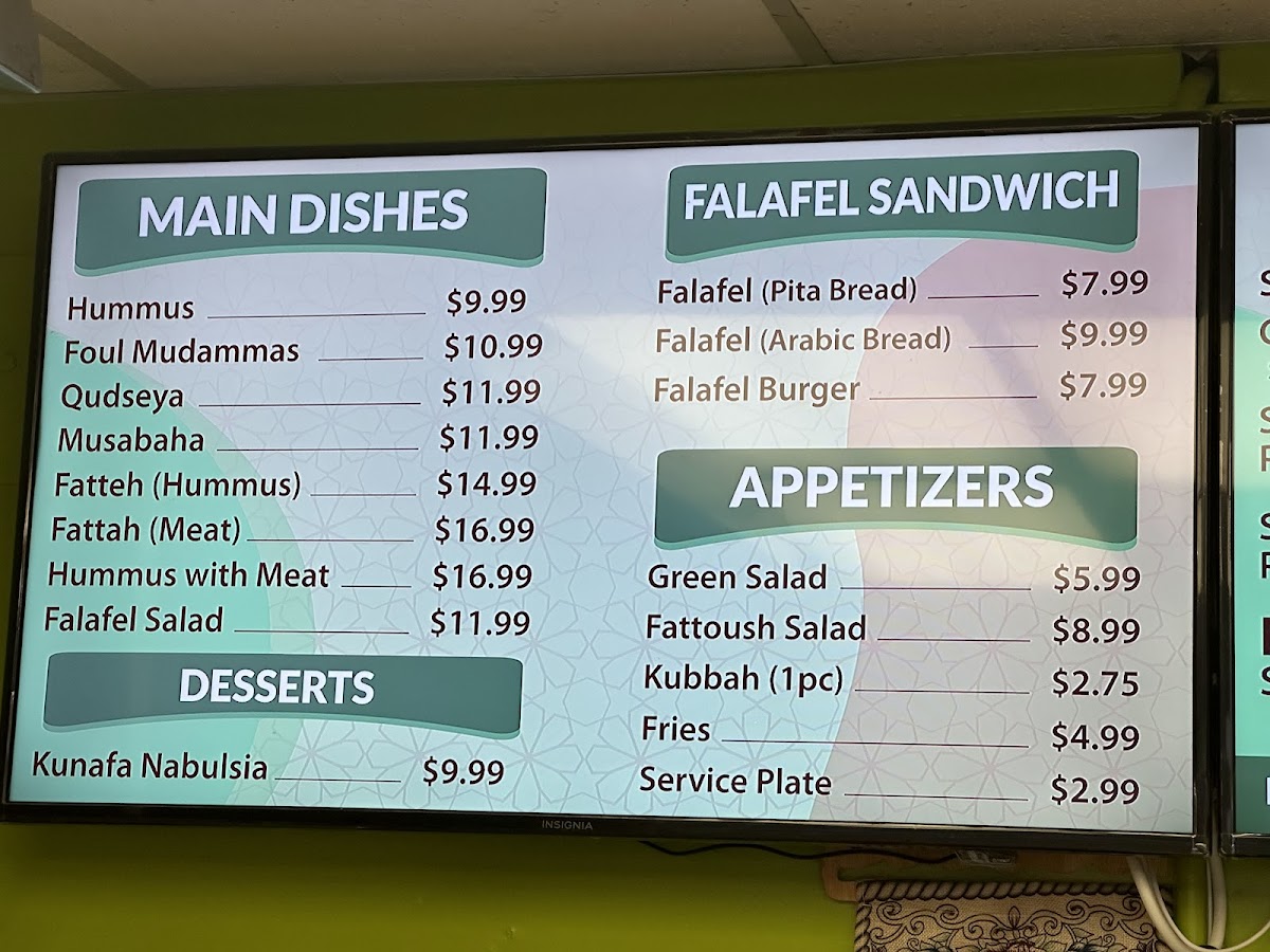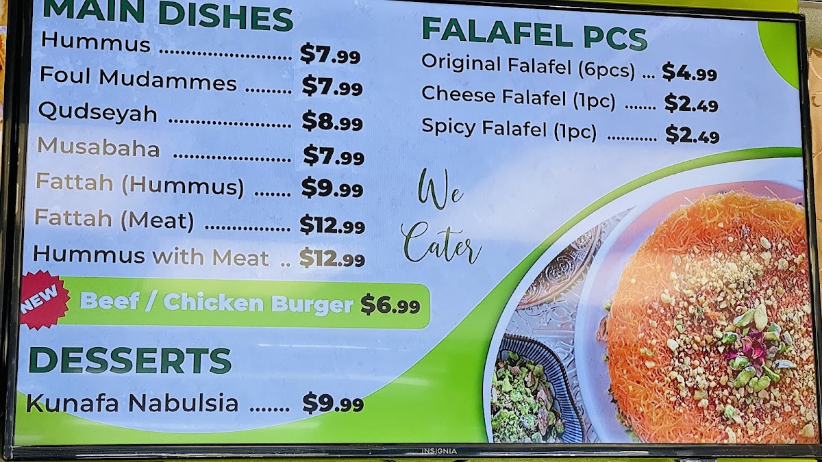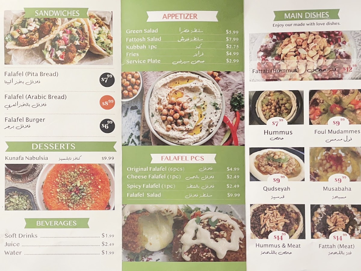 Typical offerings include warm, crisp falafel served in various forms—from classic sandwiches to unique options like stuffed falafel with cheese or a falafel burger. Light salads such as fattoush bring a refreshing balance, while traditional appetizers like hummus with meat or foul moudames add hearty, comforting textures. For those with a sweet tooth, the kunafa nabulsia provides a gentle, indulgent finish.
